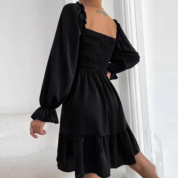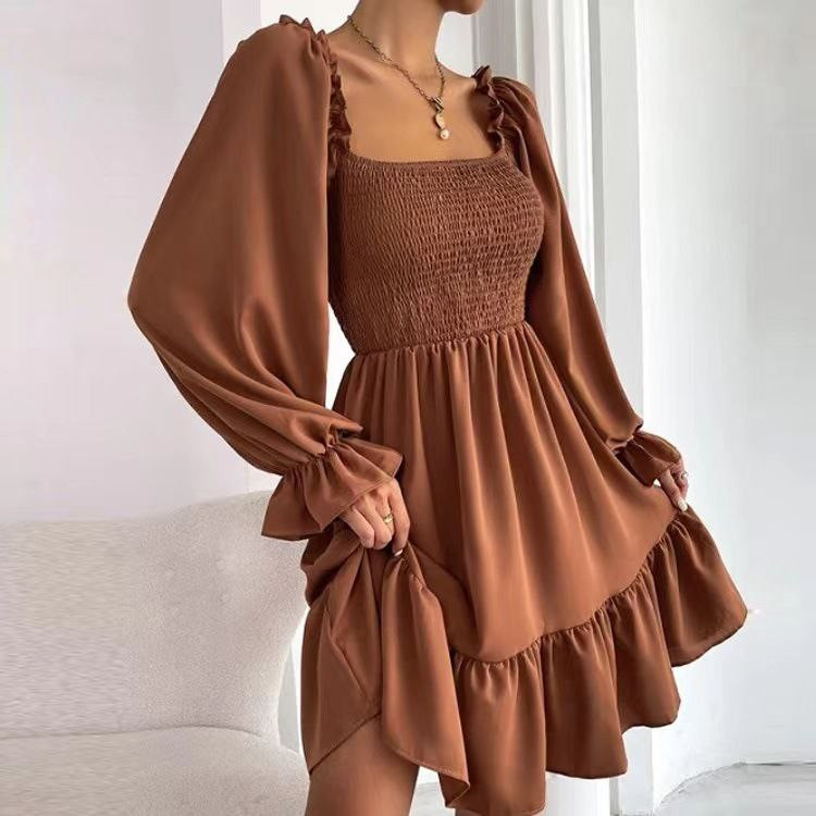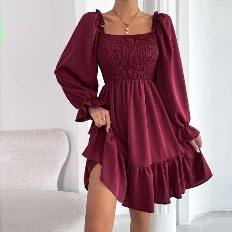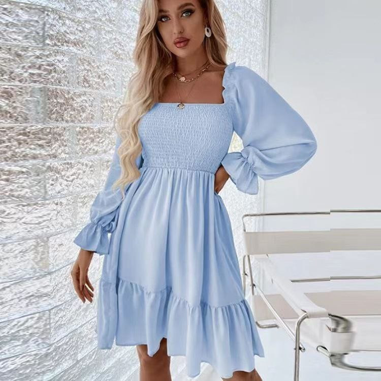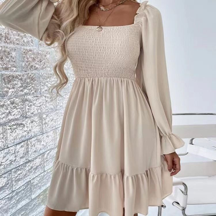 Robe de couleur unie 2023 printemps style minimaliste européen et américain col carré taille haute manches longues robe taille mince pour les femmes