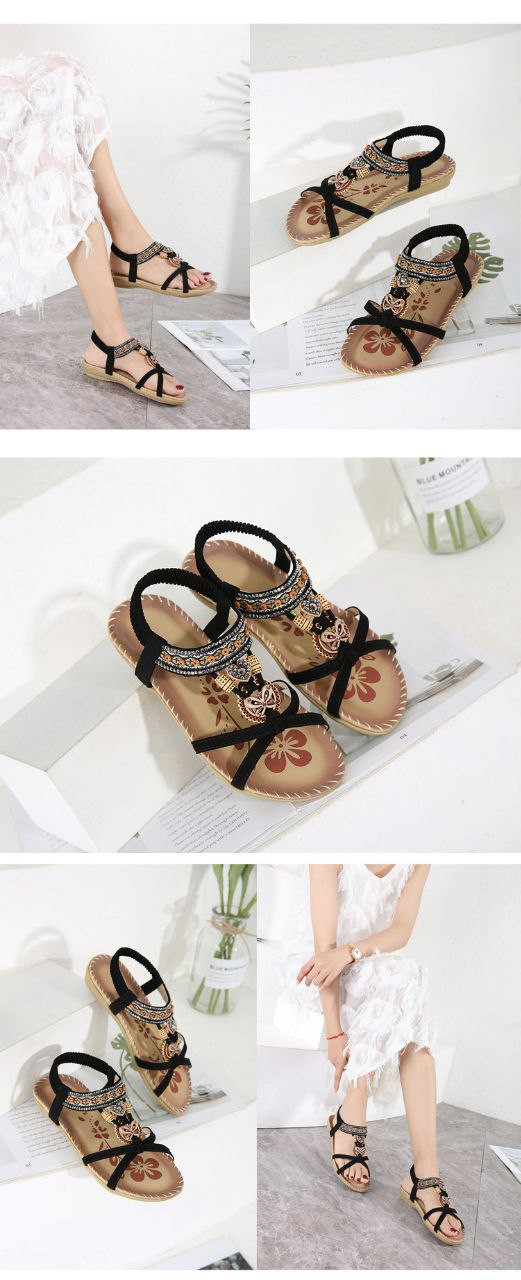 Bohème 2024  nouvelles sandales transfrontalières de grande taille à fleurs plates en strass sandales de plage à bout ouvert