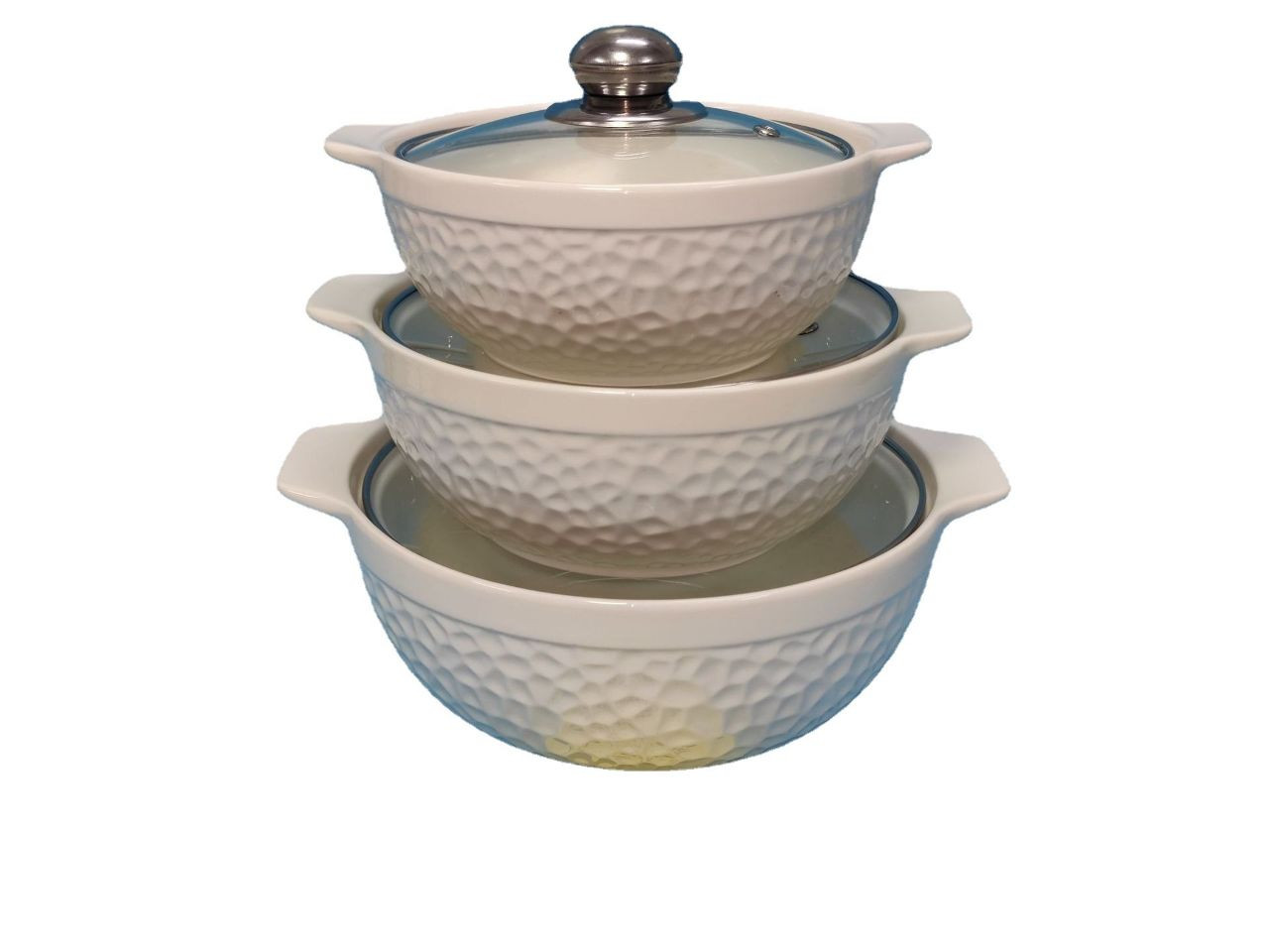 Un ensemble de trois bols de service ou cocottes en céramique empilables, de couleur blanche et de tailles différentes, chacun avec un couvercle en verre et une poignée métallique sur le dessus du couvercle.