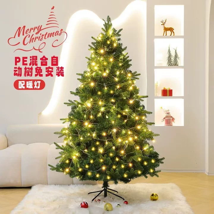 Sapins de Noël artificiels avec guirlandes et accessoires disponibles en plusieurs tailles.